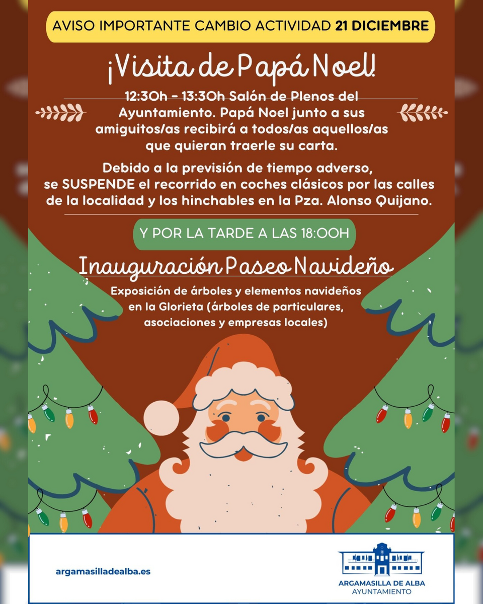 El Ayuntamiento de Argamasilla de Alba informa de un cambio en la programación navideña prevista para el domingo 21 de diciembre, debido a la…