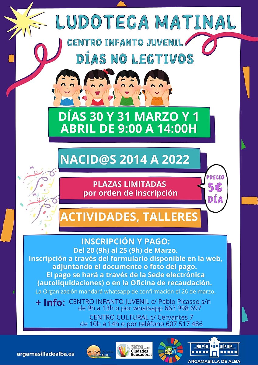 Ludoteca matinal los días 30, 31 de marzo y 1 de abril de 2026, en horario de 9:00 a 14:00 horas.