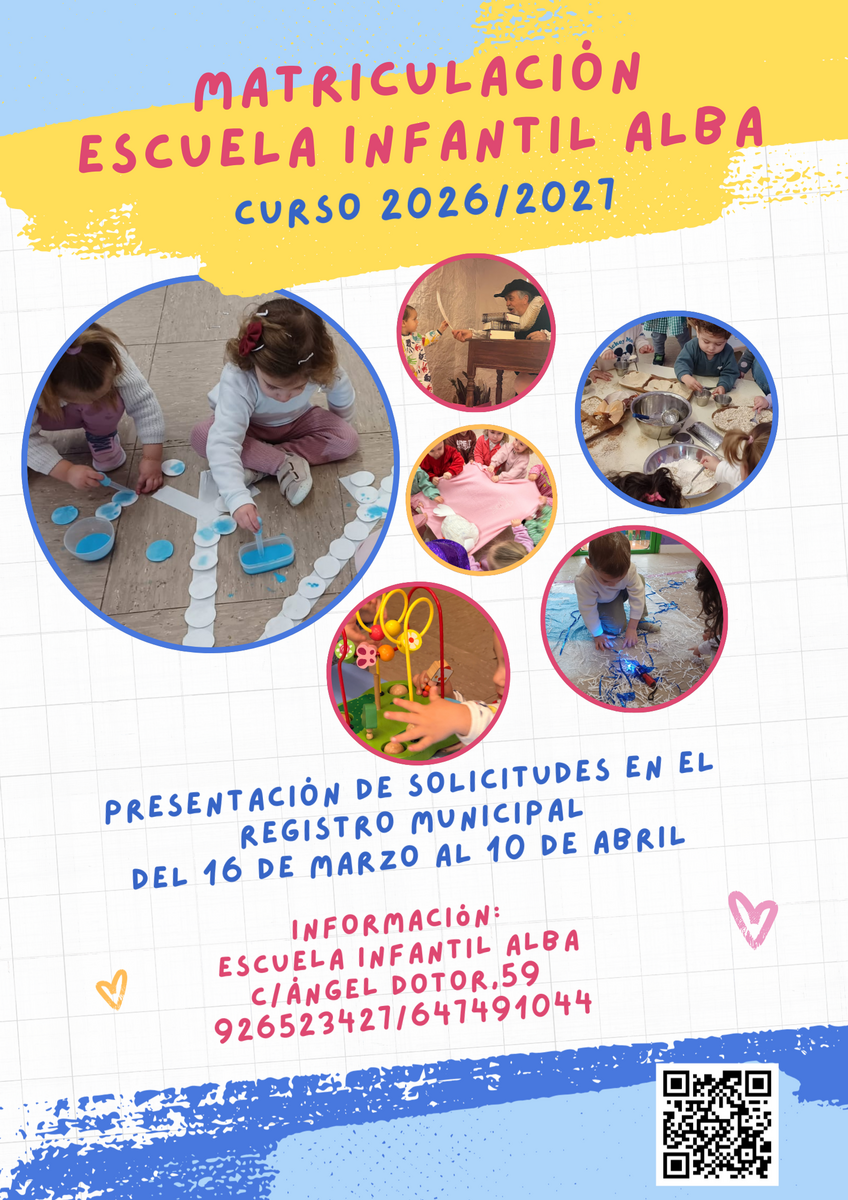 Desde el 10 de marzo al 10 de abril estará abierto el plazo de matriculación para el curso escolar 2026-2027 en la Escuela Infantil Municipal "Alba".