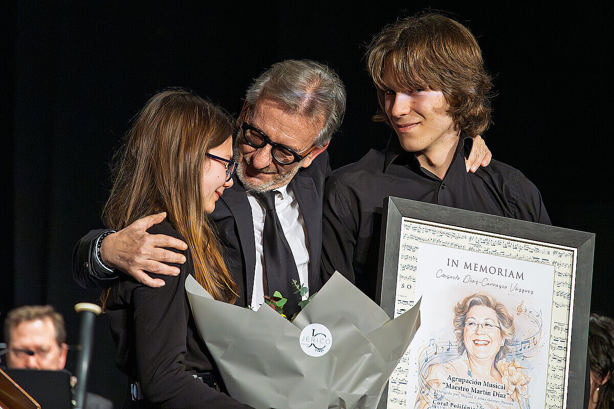 Uno de los momentos más emotivos de la noche tuvo lugar cuando la directiva de la Agrupación Musical Maestro Martín Díaz, junto a los directores Miguel Carlos Gómez Perona y Francisco Javier Gómez Alcolea, subieron al escenario para hacer entrega a sus nietos, Adrián y Elsa, de un ramo de flores y del cuadro con el cartel del evento, como recuerdo y reconocimiento a la figura de su abuela.