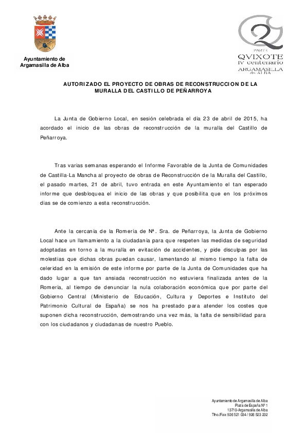 Tras varias semanas esperando el Informe Favorable de la Junta de Comunidades de Castilla-La Mancha al proyecto de obras de Reconstrucción de la Muralla del Castillo, el pasado martes, 21 de abril, tuvo entrada en este Ayuntamiento el tan esperado informe que desbloquea el inicio de las obras y que posibilita que en los próximos días se de comienzo a esta reconstrucción. Ante la cercanía de la Romería de Nª. Sra. de Peñarroya, la Junta de Gobierno Local hace un llamamiento a la ciudadanía para que respeten las medidas de seguridad adoptadas en torno a la muralla en evitación de accidentes, y pide disculpas por las molestias que dichas obras puedan causar, lamentando al mismo tiempo la falta de celeridad en la emisión de este informe por parte de la Junta de Comunidades que ha dado lugar a que tan ansiada reconstrucción no estuviera finalizada antes de la Romería, al tiempo de denunciar la nula colaboración económica que por parte del Gobierno Central (Ministerio de Educación, Cultura y Deportes e Instituto del Patrimonio Cultural de España) se nos ha prestado para atender los costes que suponen dicha reconstrucción, demostrando una vez más, la falta de sensibilidad para con los ciudadanos y ciudadanas de nuestro Pueblo.