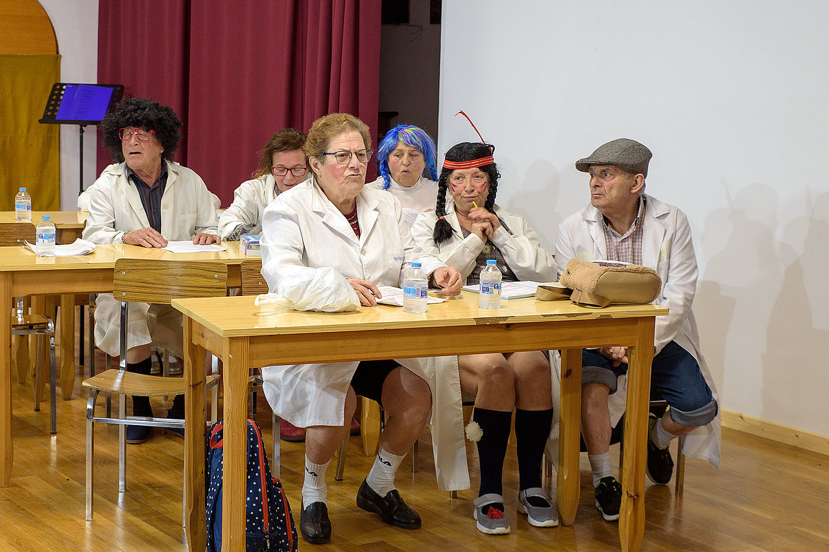 El acto comenzó con un recuerdo en forma de video de aquellos socios y socias que se fueron en los últimos años. Seguidamente, el grupo de teatro del Centro de Día representó una obra que escenificaba una peculiar escuela de los años 60, donde parece que algunos y algunas de los escolares desaprendían más que aprendían.