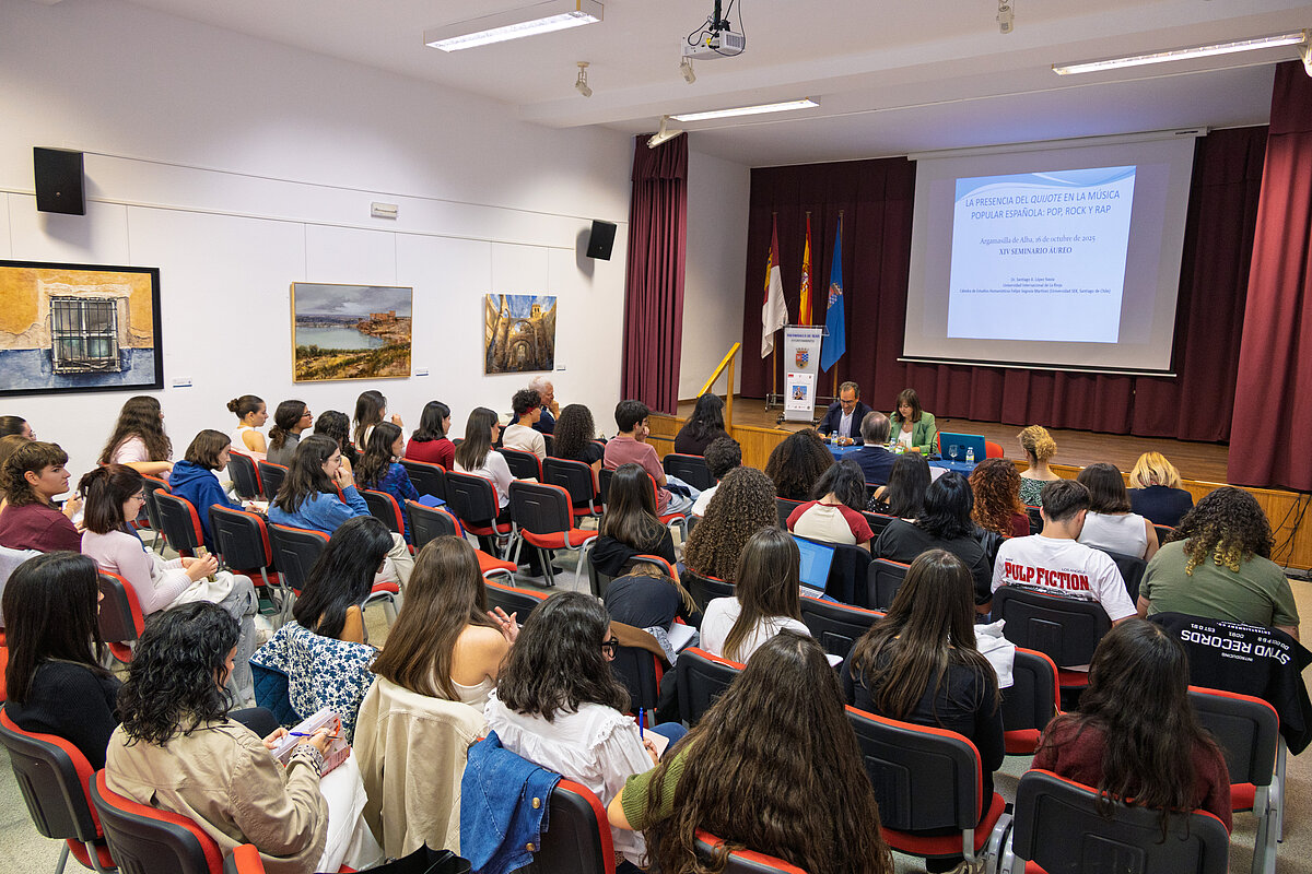 La primera ponencia corrió a cargo del Dr. Santiago A. López Navia, profesor de la Universidad Internacional de La Rioja y de la Universidad SEK de Chile, con la conferencia “La presencia del Quijote en la música popular española: pop, rock y rap”. López Navia ofreció un recorrido por las múltiples recreaciones musicales inspiradas en la obra cervantina, desde el heavy metal hasta la canción de autor, mostrando cómo Don Quijote esta “en el ambiente”, tal y como afirmaba Julián Marías.