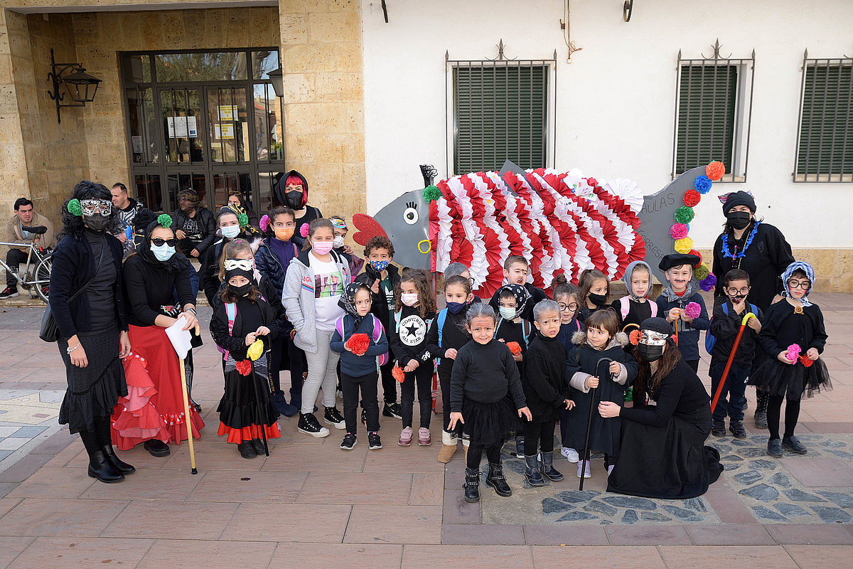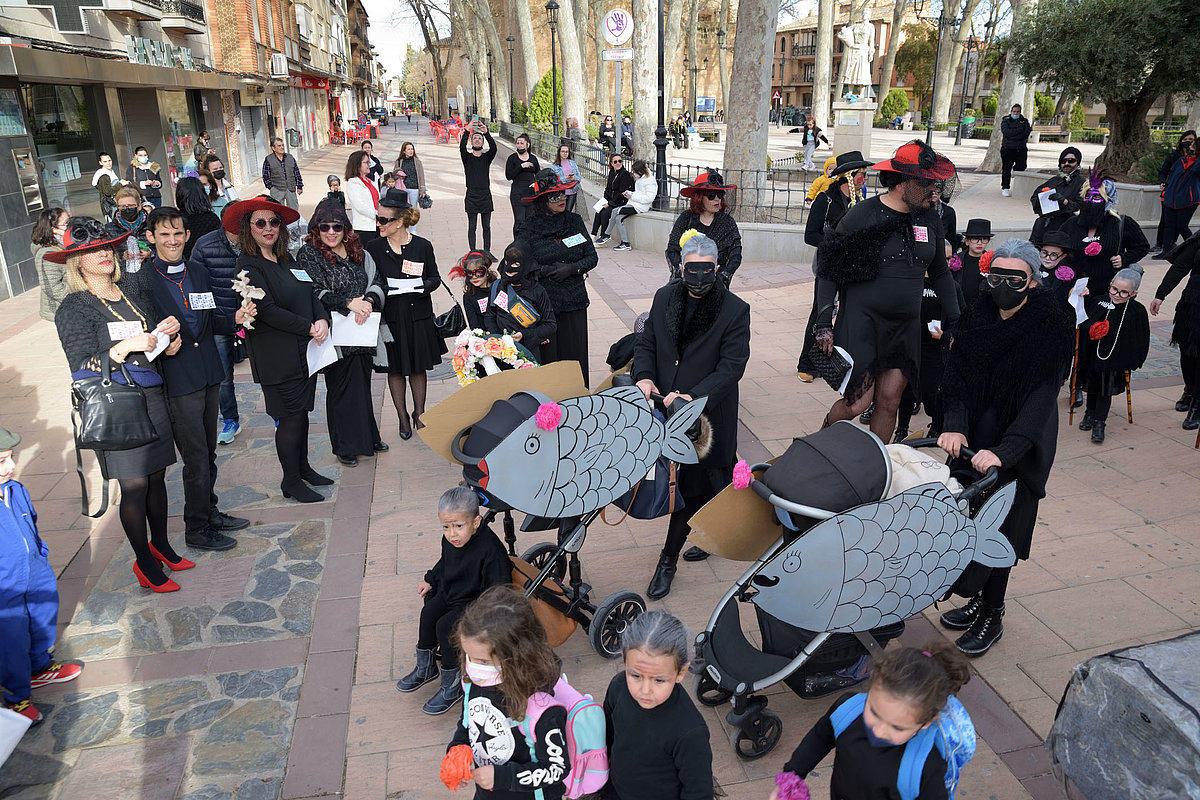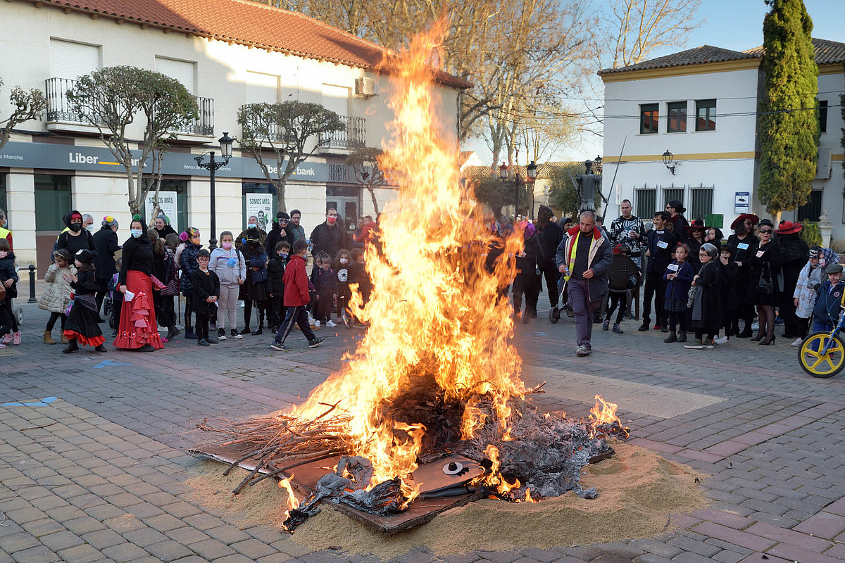 El cortejo fúnebre ha recorrido las calles más céntricas de la localidad para que todos los vecinos y vecinas tuvieran la oportunidad de salir a la calle a despedirse de la sardina antes de ser incinerada en la plaza de Alonso Quijano, donde este año ha finalizado el recorrido.