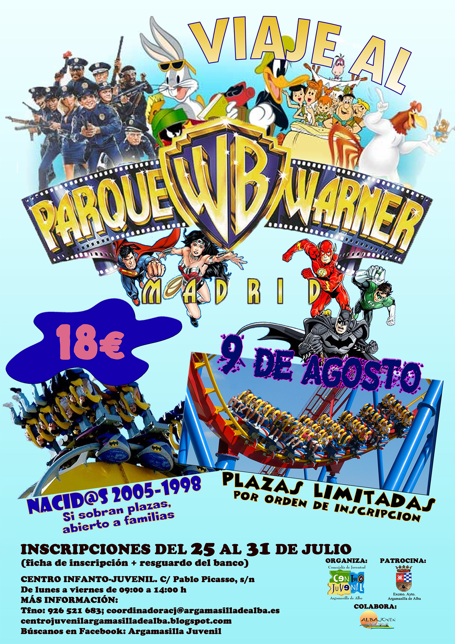 Por otro lado, los jóvenes argamasilleros de entre 12 y 18 años tendrán la posibilidad realizar un nuevo viaje al Parque Warner (Madrid) el día 9 de agosto, una salida muy atractiva que permitirá a los participantes ver espectáculos y subir en las diversas atracciones tematizadas.