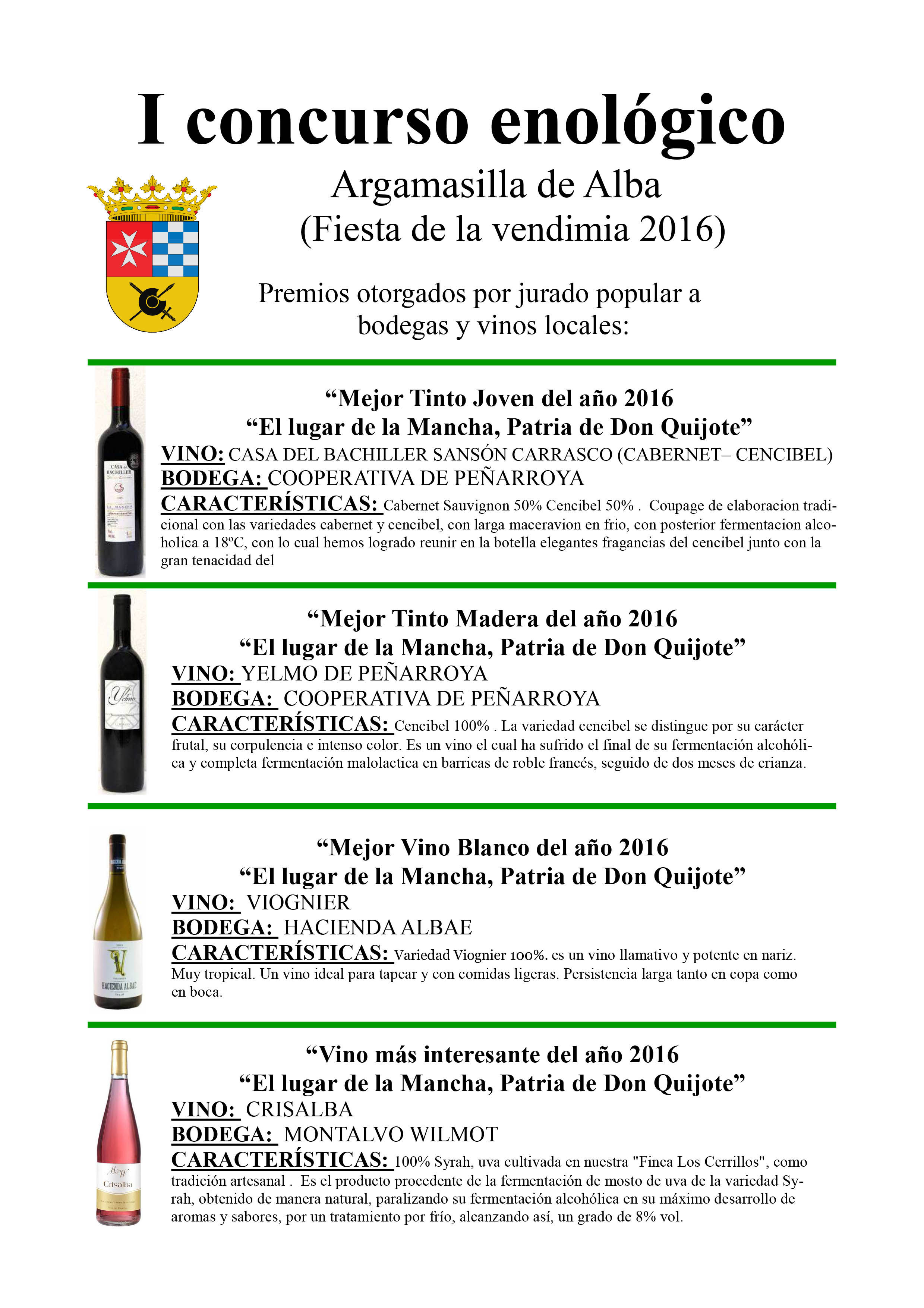 Según el jurado popular, los vinos premiados en esta primera edición de “El lugar de la Mancha, Patria de Don Quijote” fueron: el mejor blanco del año 2016 fue ‘Viognier’, de Hacienda Albae; el tinto joven del año 2016 para ‘Casa de Bachiller Sansón Carrasco’ (Cabernet-Cencibel), de la Coop. Ntra. Sra. de Peñarroya; el mejor tinto madera del año 2016 para ‘Yelmo de Peñarroya’, también de la Coop. Ntra. Sra. de Peñarroya; mientras que el premio al vino más interesante fue para ‘Crisalba’, de la Bodega Montalvo Witmot.