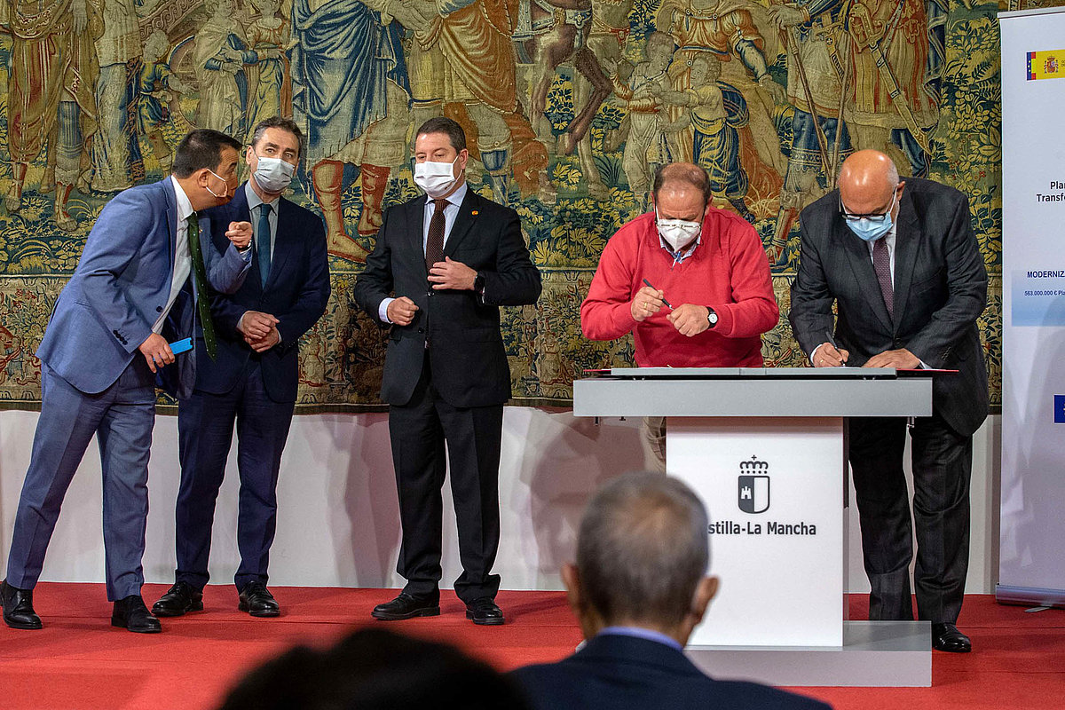 El alcalde de Argamasilla de Alba, Pedro Ángel Jiménez, junto con una amplia representación de la Comunidad de Regantes Pantano Estrecho de Peñarroya, con su presidente, Bernabé Ruiz, al frente, han asistido este miércoles 30 en Toledo a la firma de un convenio con la Sociedad Estatal de Infraestructuras Agrarias (SEIASA) que posibilitará la inversión de más de 21 millones de euros, de los cuales el 80 por ciento correrá a cargo de la SEIASA y desde el Gobierno de Castilla-La Mancha se va a contribuir con una aportación extraordinaria de 3,4 millones de euros, siendo el resto aportado por la comunidad de regantes; un acto que ha contado con la asistencia del presidente de Castilla-La Mancha, Emiliano García-Page.