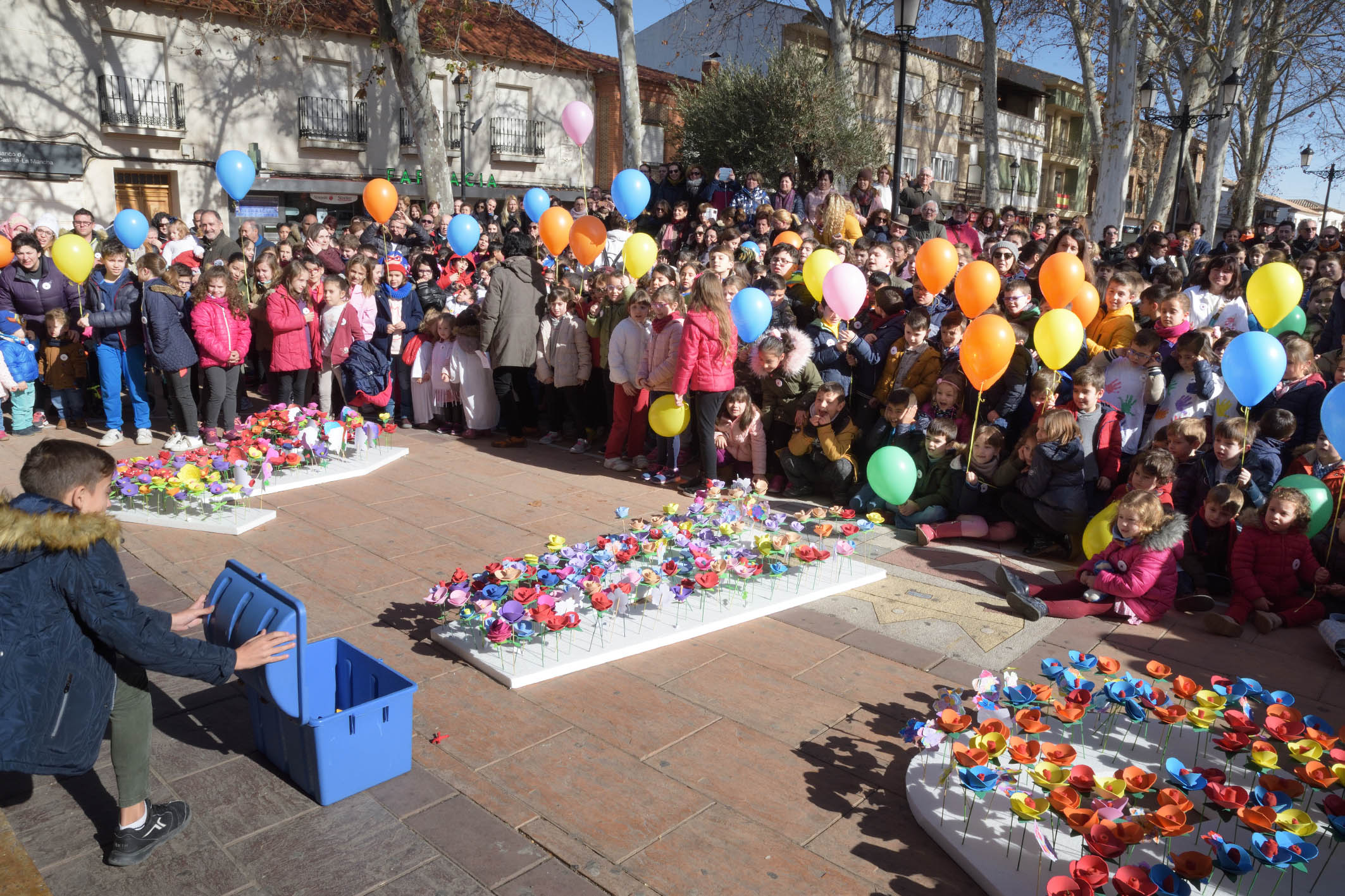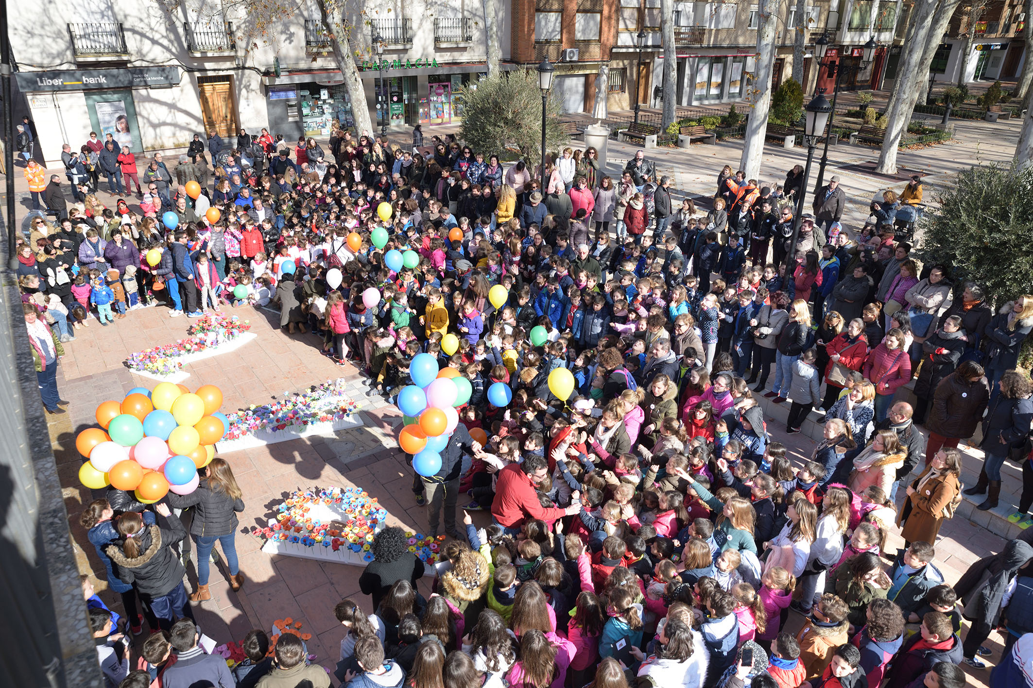 Bajo el lema “Mi rosa de la Paz”, en torno a 750 escolares y estudiantes de Argamasilla de Alba se han concentrado este martes día 30 a las 12.00 h. frente al Ayuntamiento con motivo del Día Escolar de la No Violencia y la Paz. El acto se abrió con la lectura del “Manifiesto por la Paz y la No Violencia”, al que pusieron voz cuatro alumnos, uno por centro educativo, en representación de la comunidad escolar de Argamasilla de Alba. En dicho manifiesto mostraban su preocupación “por la persistencia de los conflictos y el aumento de la violencia en diversas partes del mundo, por la existencia del terrorismo y la guerra”. “No basta con la denuncia, es tiempo de acción, no basta con conocer, escandalizados el número de niños explotados, el número de refugiados o de hambrientos. Se trata de reaccionar, todos y cada uno de nosotros. No hay que contemplar solamente lo que hacen los gobiernos, tenemos que desprendernos de una parte de ‘lo nuestro”, se afirma en el manifiesto. La educación debe ser el arma única y más poderosa que puede usarse en contra de la violencia y a favor de la paz; “por eso, hoy, día de la Paz y la No violencia, estamos aquí toda la comunidad educativa de la localidad, para decir que nos comprometemos a construir la paz desde la convivencia diaria en todos los ámbitos de nuestra vida”. Además, los jóvenes portavoces aseguraron durante la lectura mostrarse alarmados por el incremento de situaciones de acoso escolar, por conductas agresivas y violentas en internet y en las redes sociales hacia las personas diferentes, sobre las que se asientan infinitas conductas de discriminación, odio y violencia que dañan la dignidad, libertad e igualdad de derechos de todos los seres humanos e impiden una convivencia en tolerancia y concordia, porque la paz no es solo la ausencia de conflictos. A la lectura del manifiesto le siguió la interpretación por todos los asistentes del tema ‘Rosa de la Paz’ de Amaral, finalizando la interpretación con la suelta de globos y de palomas. Seguidamente se ha subido y colgado de la fachada del Ayuntamiento las letras realizadas con decenas de rosas hechas por los escolares en goma EVA, formando la palabra Paz y la silueta de una paloma. Desde el Ayuntamiento, una clase de cada centro, se han trasladado a la denominada “Pared de la Paz” situada en la Escuela Infantil “Alba”, donde todos: escolares, estudiantes, maestros y profesores han dibujado un particular arco iris con las palmas de sus manos impregnadas en pintura de diferentes colores.