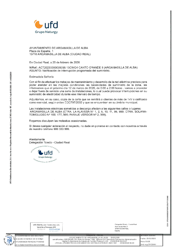 Con el fin de efectuar los trabajos de mantenimiento y desarrollo de la red eléctrica precisos para poder atender en las mejores condiciones las necesidades de suministro de la zona, les informamos que el próximo día 12 de marzo de 2026, de 0:00 a 2:00 horas, y de 2:00 a 4:00 horas, vamos a proceder a dejar fuera de servicio una serie de instalaciones, lo cual puede provocar interrupciones en su suministro de electricidad durante ese intervalo de tiempo.