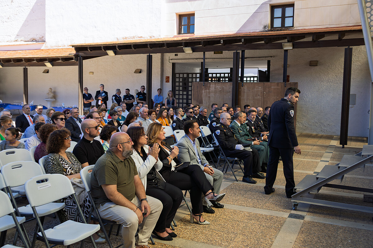 El subinspector Jefe de la Policía Local, José Carretón, subrayó en su intervención la dedicación y compromiso del cuerpo, destacando que durante el último año se realizaron más de mil intervenciones, de las cuales cerca de un centenar fueron de carácter humanitario y asistencial, además de 150 puntos de verificación de vehículos y más de 1.000 identificaciones de personas. Carretón agradeció el esfuerzo de los agentes pese a las dificultades derivadas de la falta de efectivos, pero destacó los avances logrados con la convocatoria de cinco nuevas plazas de policía local y las mejoras en las condiciones laborales impulsadas por la Corporación Municipal.