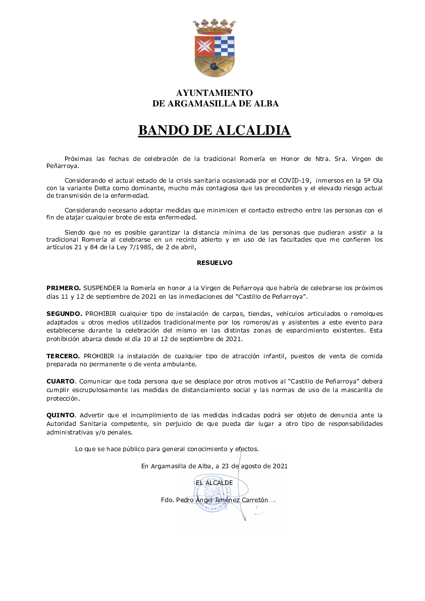 Se suspende la Romería en honor a la Virgen de Peñarroya que habría de celebrarse los próximos días 11 y 12 de septiembre de 2021 en las inmediaciones…