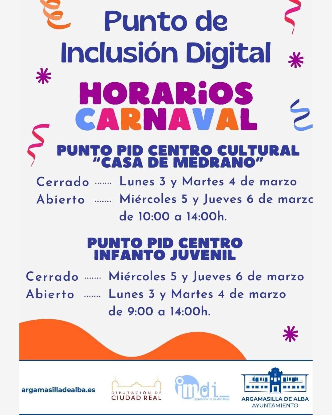 El Ayuntamiento de Argamasilla de Alba informa de los horarios especiales del Punto de Inclusión Digital (PID) durante la semana de Carnaval, con el…