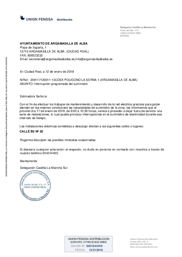 Aviso de cortes del suministro eléctrico en varias calles de Argamasilla de Alba.
