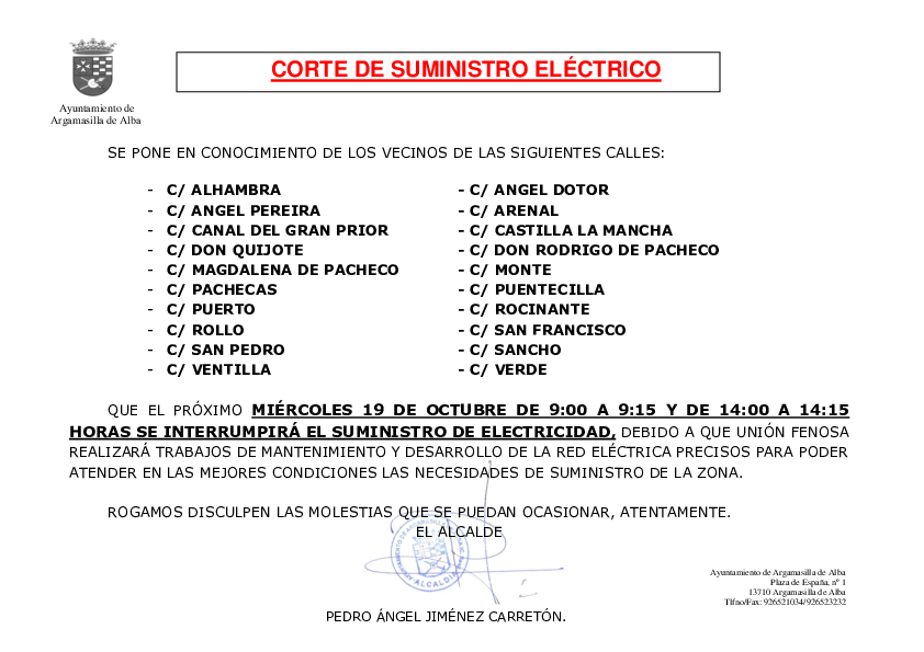 El próximo miércoles 19 de Octubre de 9:00 a 9:15 y de 14:00 a 14:15 horas se interrumpirá el suministro de electricidad en diversas calles de la…