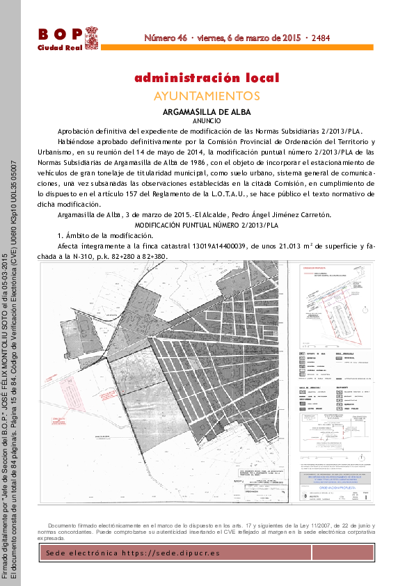 Anuncio del B.O.P. del 6 de Marzo de aprobación definitiva del expediente de modificación de las Normas Subsidiarias 2/2013/PLA.